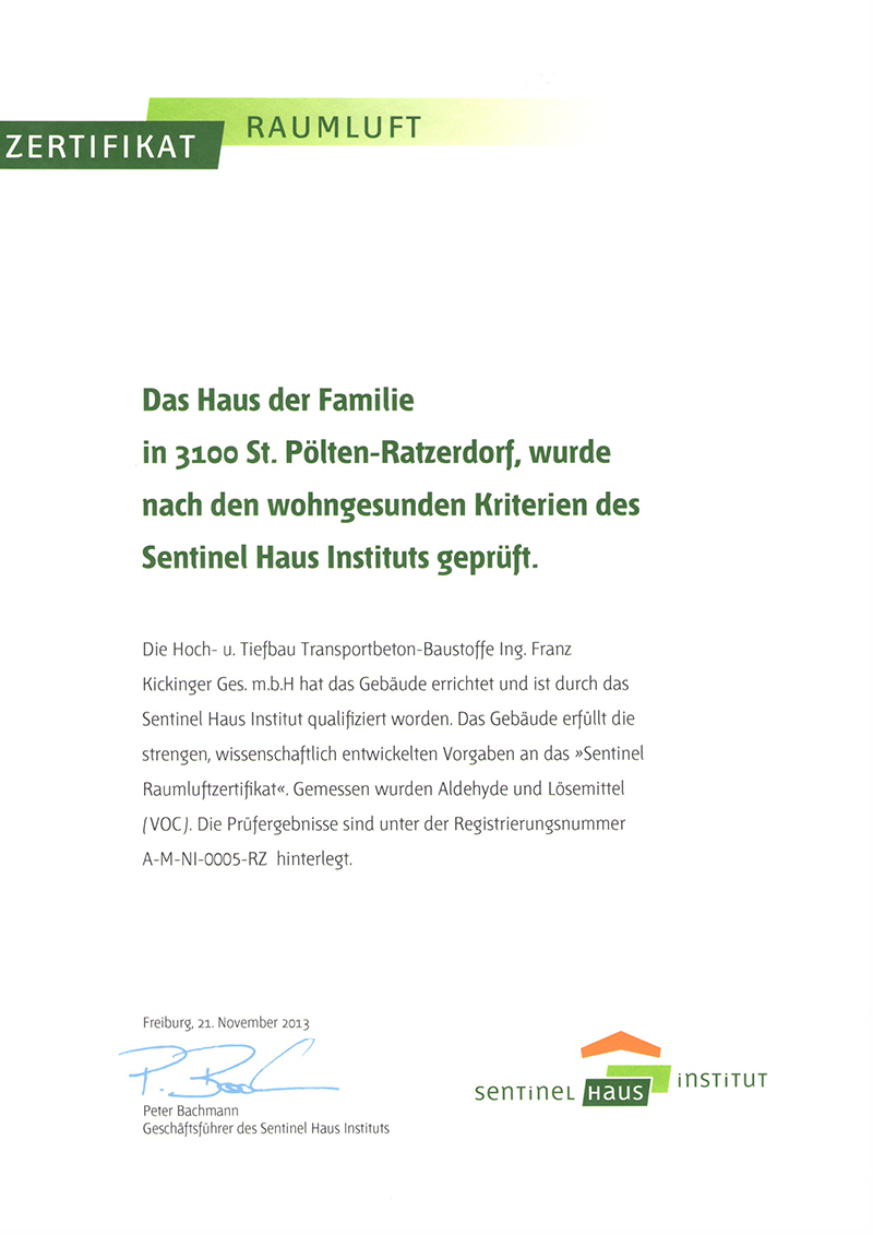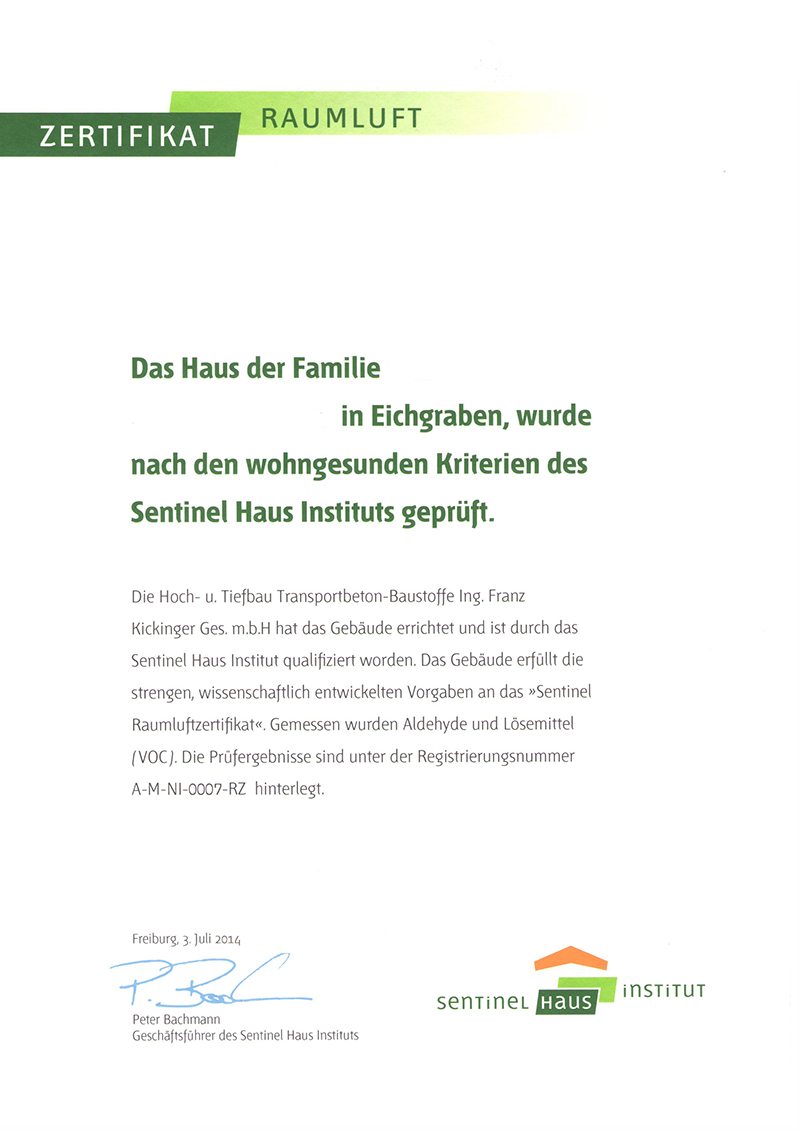 Das Raumluftzertifikat wird bei Häusern ausgestellt, die durch unsere „Zertifizierten Fachplaner für gesundes Bauen“ begleitet wurden und eine innenraumhygienisch gute Raumluftqualität mit gemessenen TVOC < 1.000 µg/m3 erreicht haben. Weitergehende Untersuchungen wie CO2, Schimmel, Feinstaub, Radon etc. werden auf Wunsch bewertet oder untersucht.
