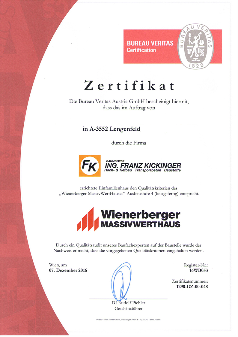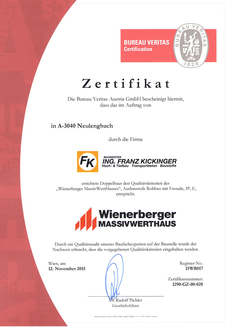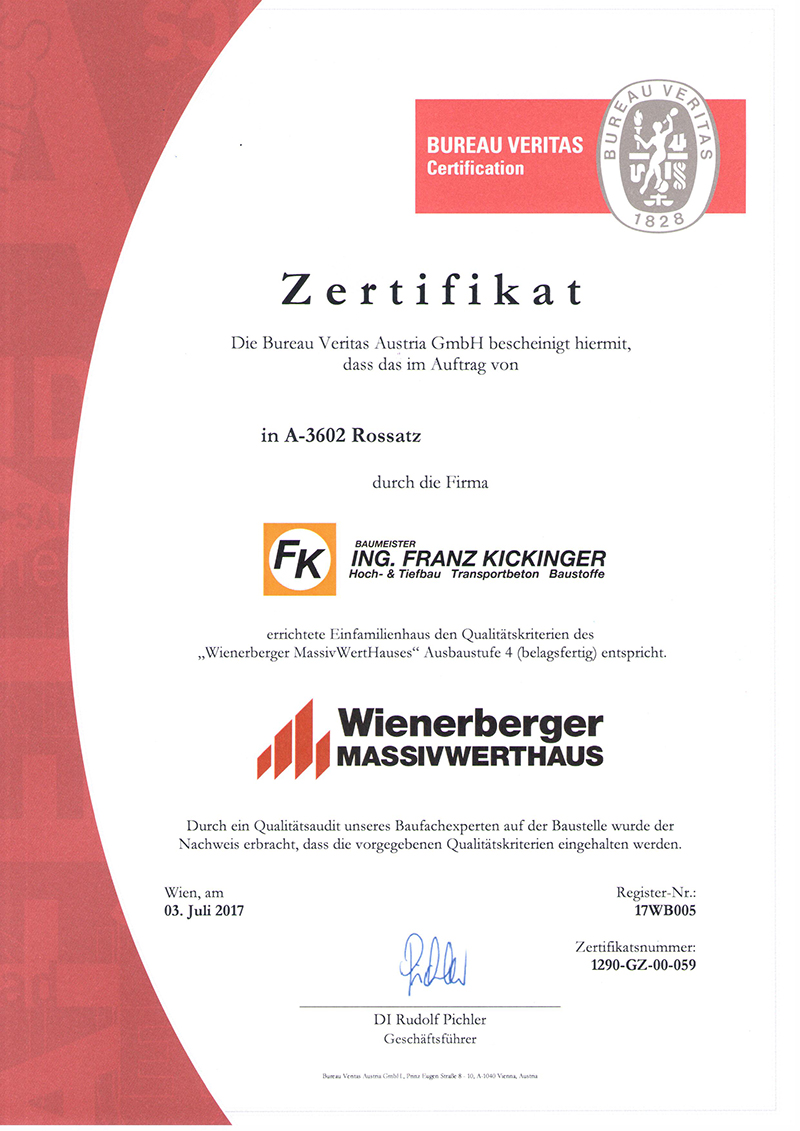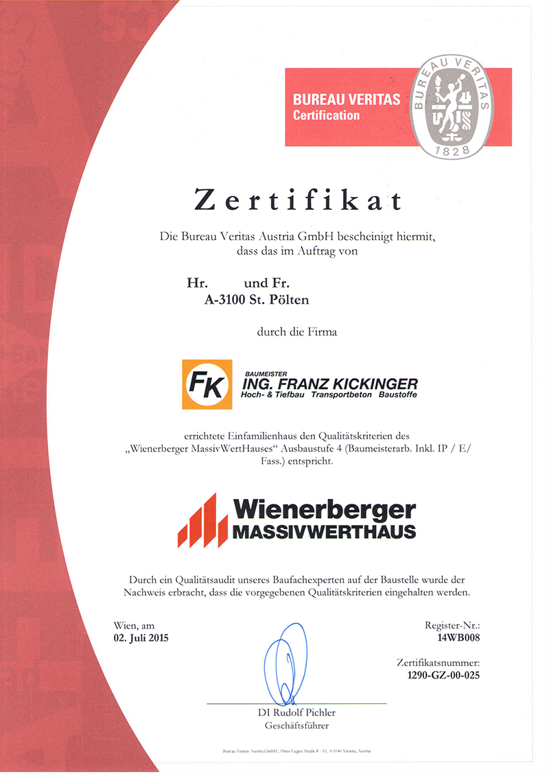 Die Qualitätsüberprüfung erfolgt durch einen unabhängigen Fachexperten der „Bureau Veritas GmbH“, dem weltgrößten Unternehmen für Zertifizierungen, je nach vereinbarter Ausbaustufe bis zu zwei mal. Damit entspricht Ihr fertiges Ziegelhaus den neuesten technischen Standards und bietet somit Sicherheit für Generationen!