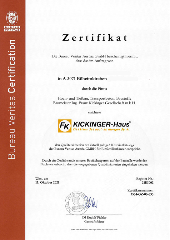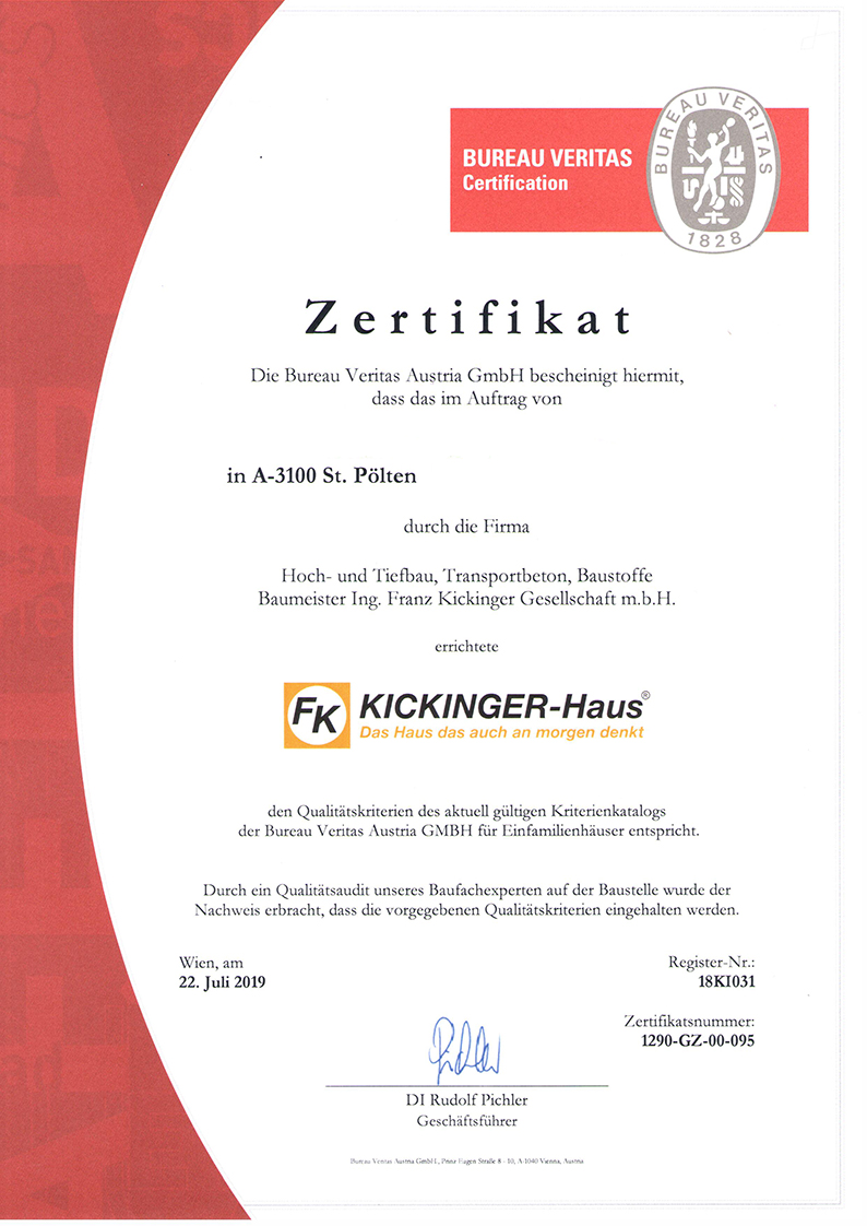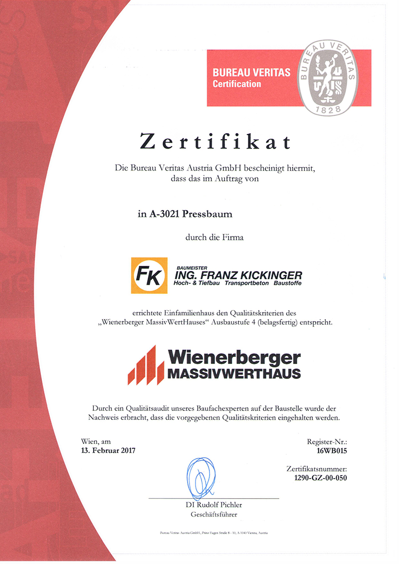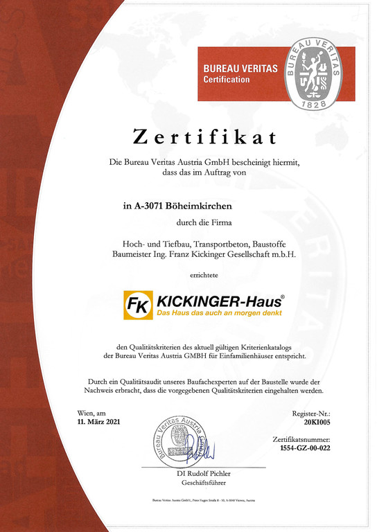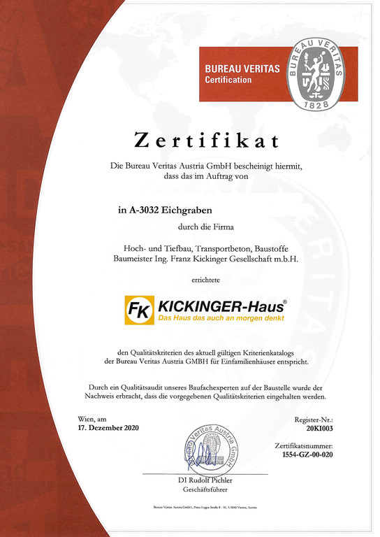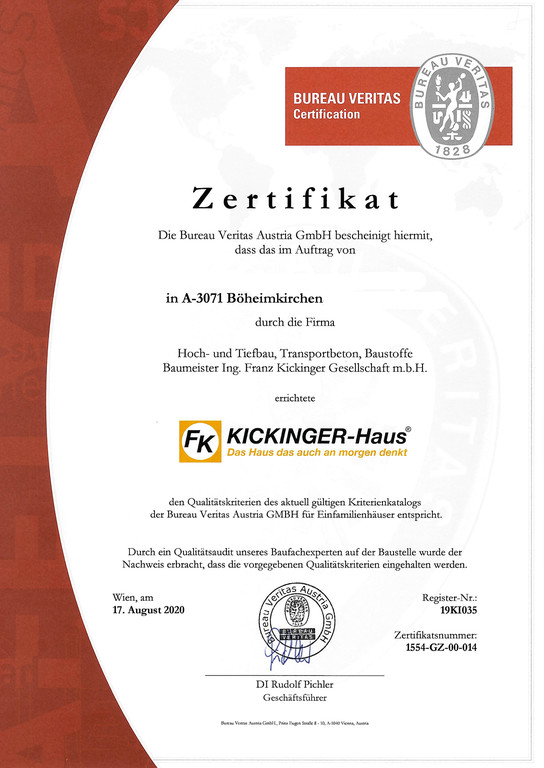 Die Qualitätsüberprüfung erfolgt durch einen unabhängigen Fachexperten der „Bureau Veritas GmbH“, dem weltgrößten Unternehmen für Zertifizierungen, je nach vereinbarter Ausbaustufe bis zu zwei mal. Damit entspricht Ihr fertiges Ziegelhaus den neuesten technischen Standards und bietet somit Sicherheit für Generationen!